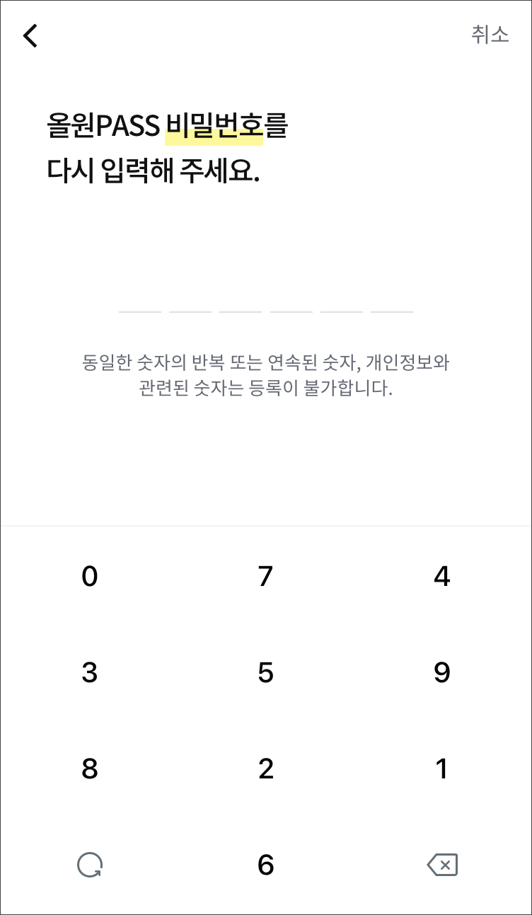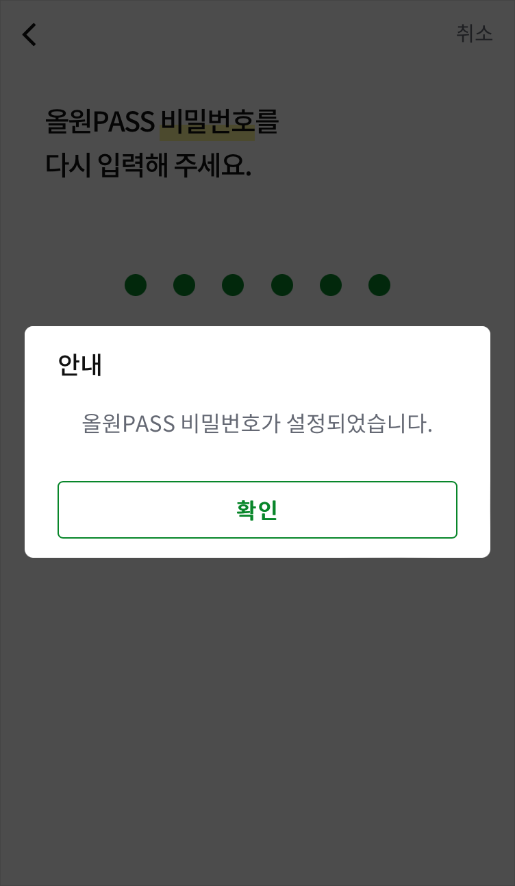 올원PASS 비밀번호 6자리를 등록합니다. 두번 입력해줍니다.