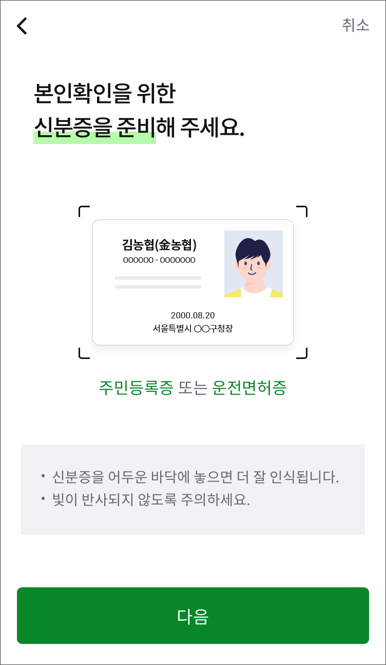 신분증 인증.(주민등록증 또는 운전면허증)