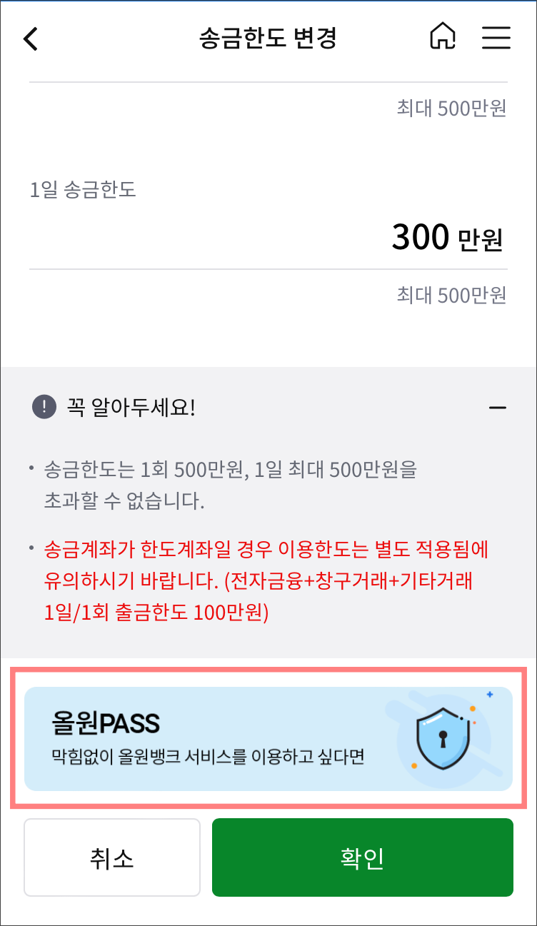 만약, 500만원 이상으로 한도를 상향 조정하고 싶다면 올원 PASS를 이용합니다.