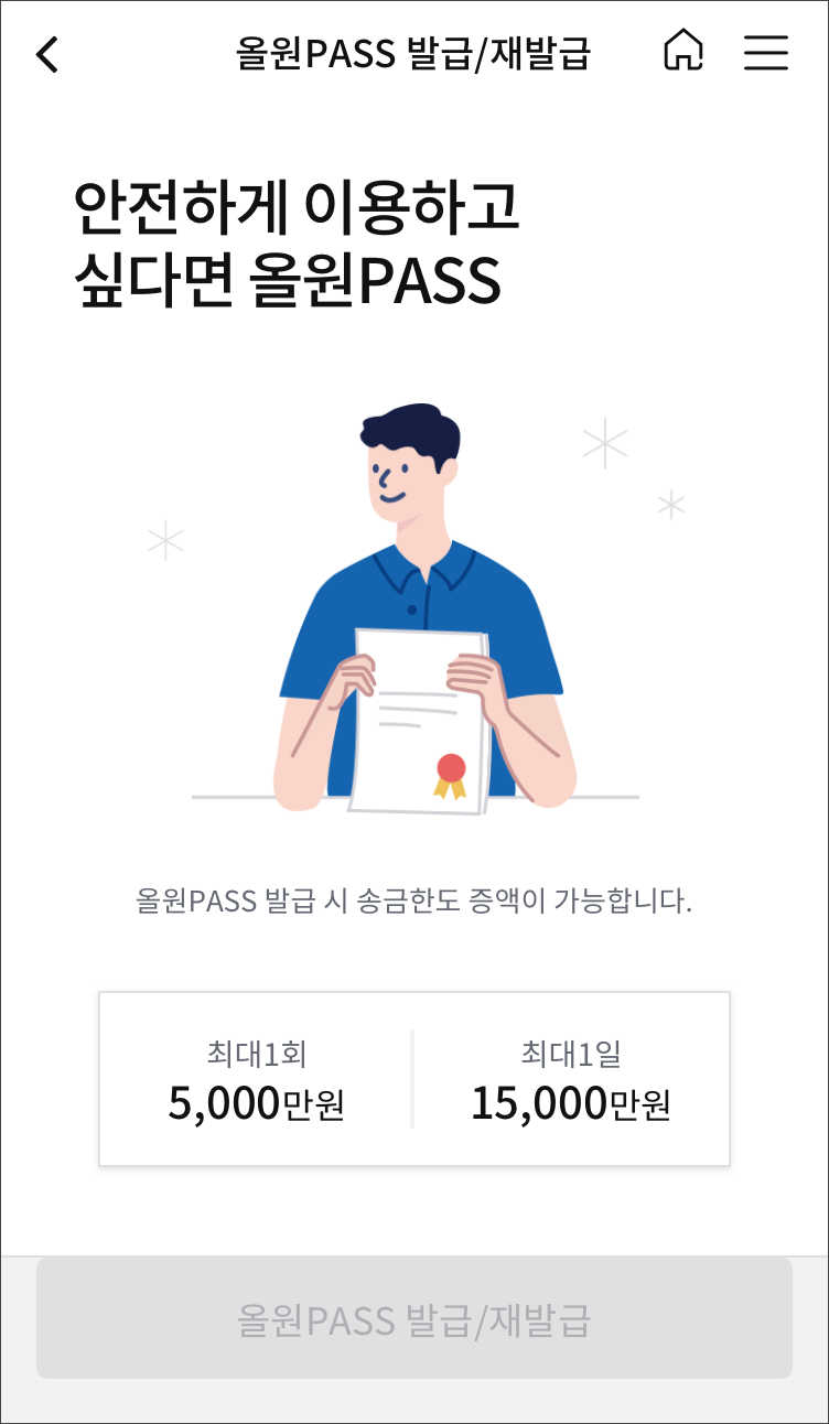 올원PASS를 이용하게 되면, 1회 최대 5,000만원 / 1일 최대 1억 5,000만원까지 송금이 가능해집니다.