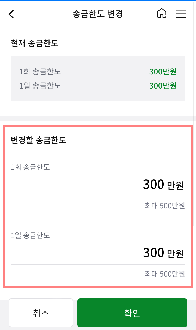 최대 500만원까지, 여기서 송금한도를 올리거나 혹은 낮게 설정할 수 있습니다.