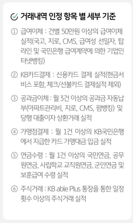 급여이체, 카드결제, 공과금이체, 가맹점결제, 연금수령, 주식거래 등 입니다.