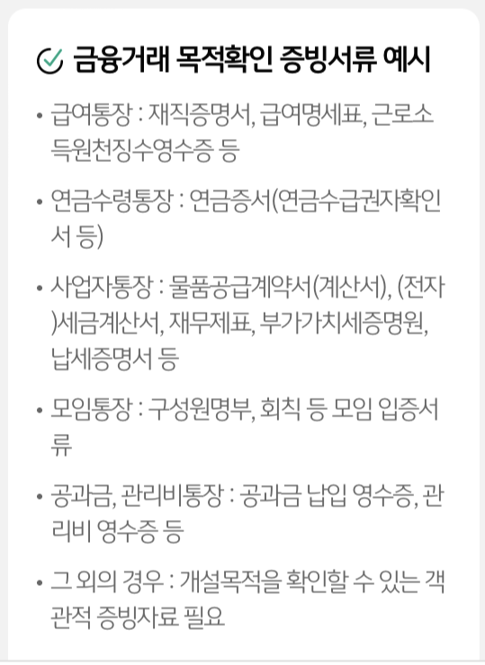 금융거래 목적 확인을 위한 증빙서류는 아래와 같아요~