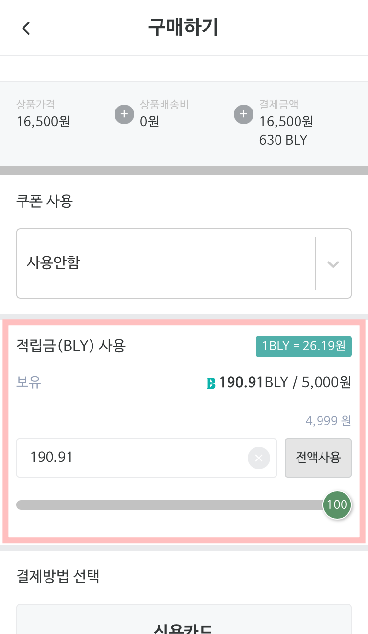 적립금(BLY)사용 부분에서 전액사용으로 선택했습니다.
