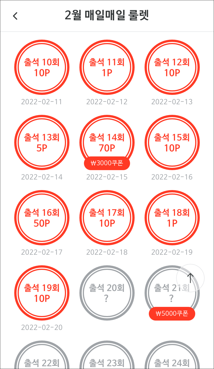7회 출석시 1,000원 쿠폰, 14회 출석시 3,000원 쿠폰, 21회 출석시 5,000원 쿠폰, 28회 출석시 10,000원 쿠폰을 얻을 수 있어요.