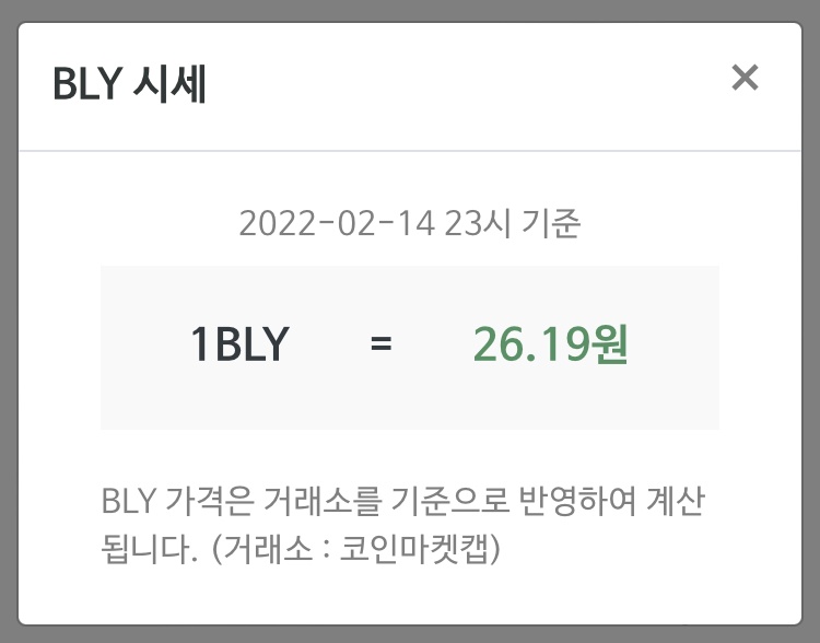 획득적립금 옆에 'BLY시세확인'을 통해 오늘의 시세를 확인할 수 있습니다.