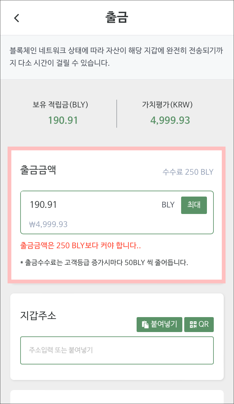 250BLY보다 커야 출금이 가능하다네요.