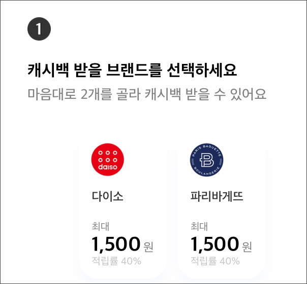 제가 사용하는 두개의 카드를 등록해두고, 이번 주 수요일에 캐시백 혜택을 받을 브랜드를 2개 선택했습니다.