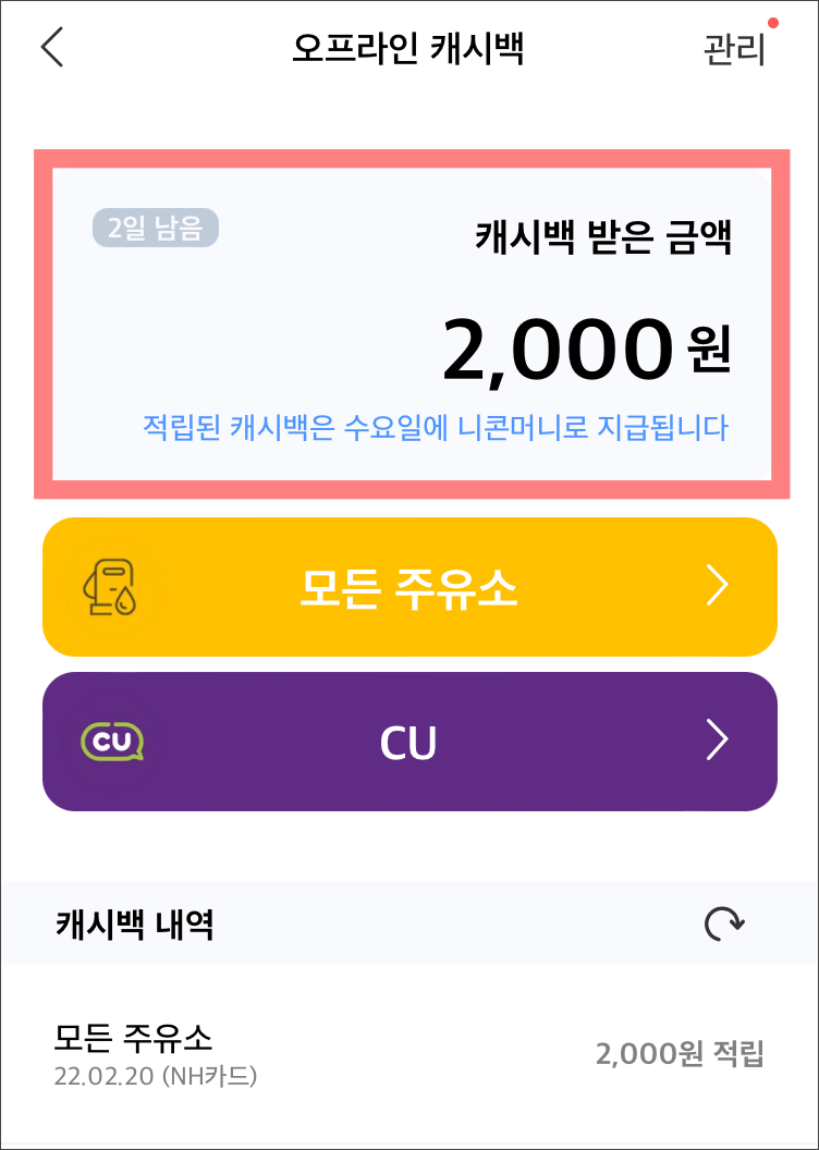 캐시백내역에 주유소에서 캐시백 받을 금액이 나오네요..