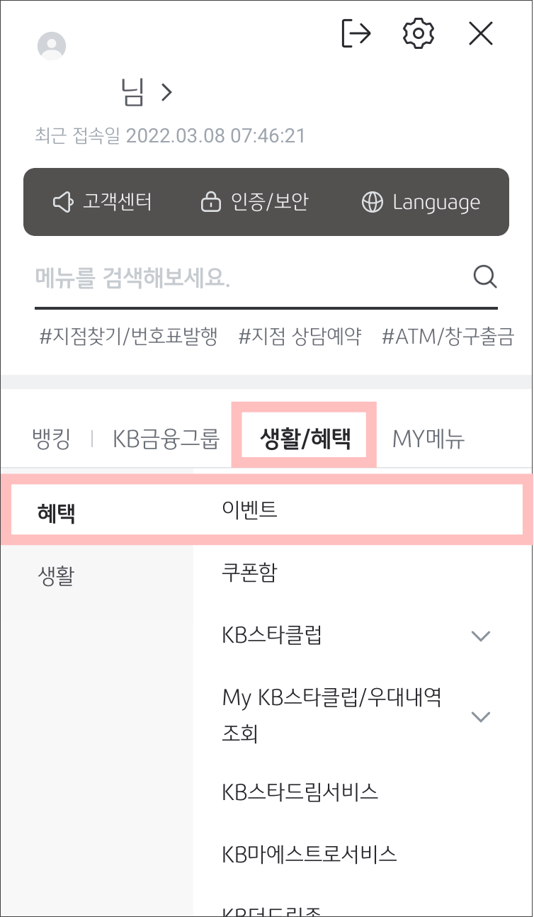 👉 KB스타뱅킹 오른쪽 상단 삼선(≡)메뉴 -> 생활/혜택 -> 혜택 -> 이벤트 -> 진행중인 이벤트