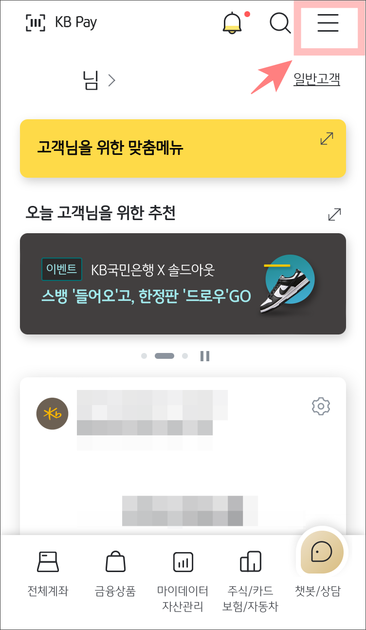 - KB스타뱅킹어플에서 왼쪽 상단에 KB Pay로 들어갑니다.