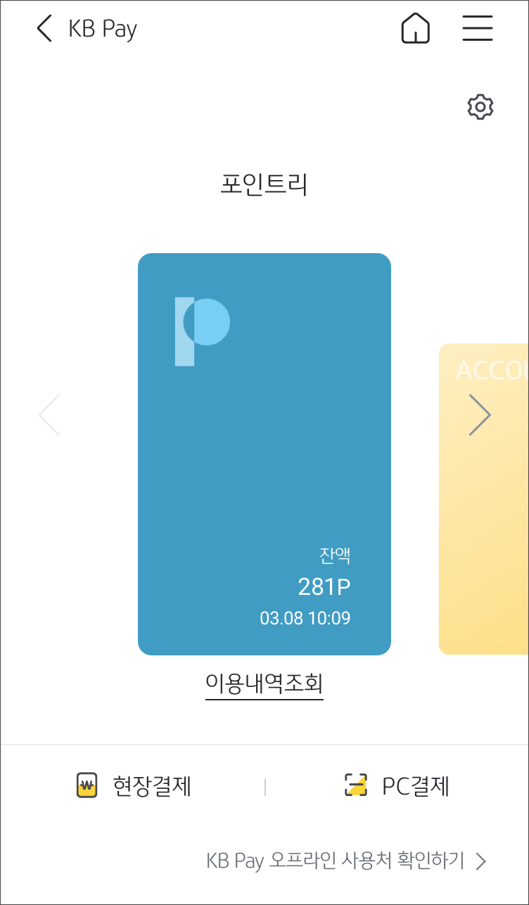 KB페이는 국민은행의 간편결제 서비스로, KB스타뱅킹어플에서도 바로 이용이 가능하게 되어있었습니다.