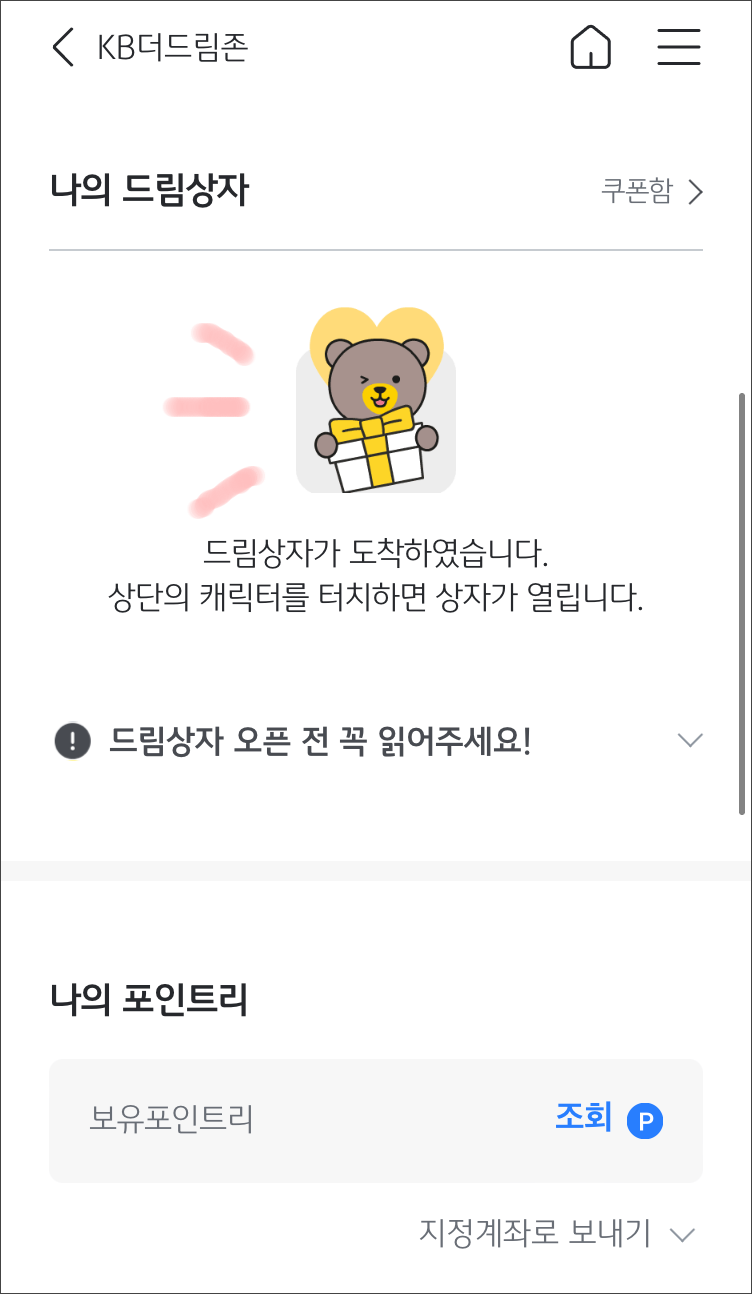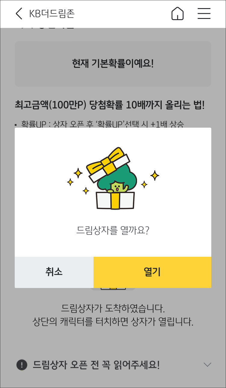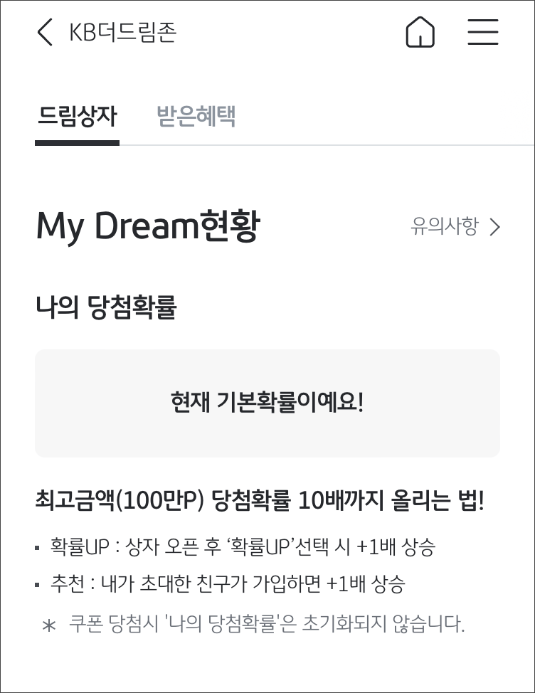 아무래도 국민은행 계좌로 거래(자동이체 및 납부)가 많고, 입금하는 금액이 클수록 드림상자를 많이 받게 되고,