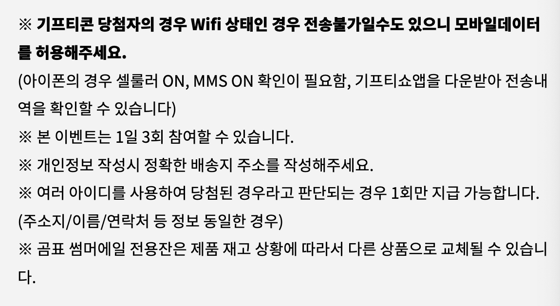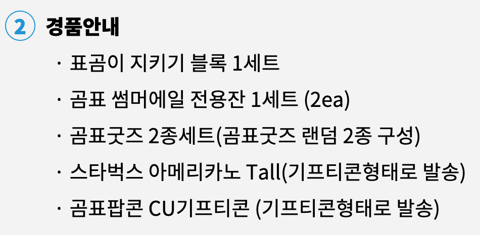 - 곰표팝콘, 스타벅스 아메리카노 기프티콘은 당첨일 +7일까지 확인 된 휴대폰번호로 전송해드립니다.