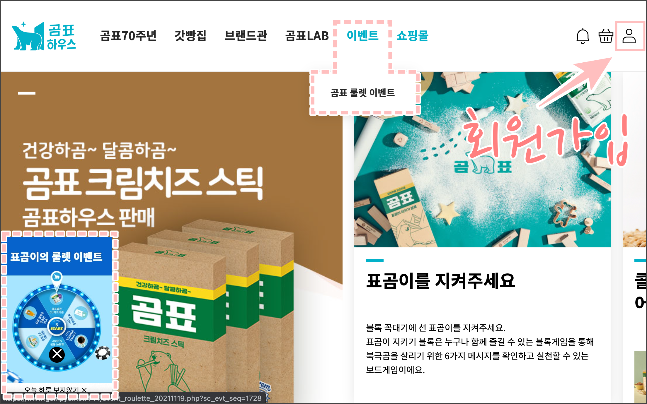 상단의 이벤트 - 곰표룰렛이벤트 메뉴를 이용하거나, 메인에 작은 팝업창 뜨는 표곰이의 룰렛이벤트를 클릭합니다.