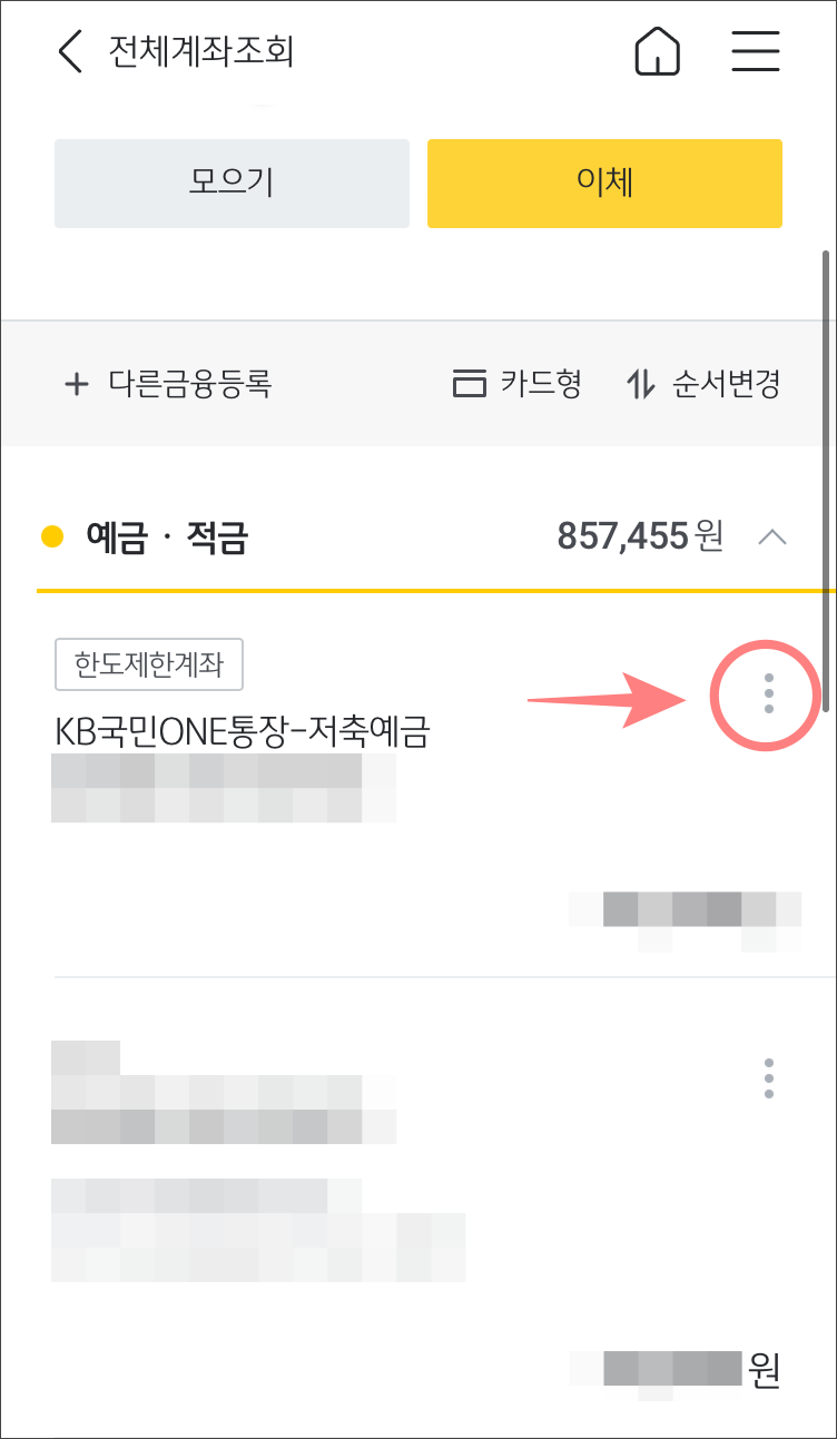 갖고 있는 계좌 중, 사본발급이 필요한 계좌 옆에 세로로 점이 세개가 있는 더보기 메뉴를 클릭합니다.