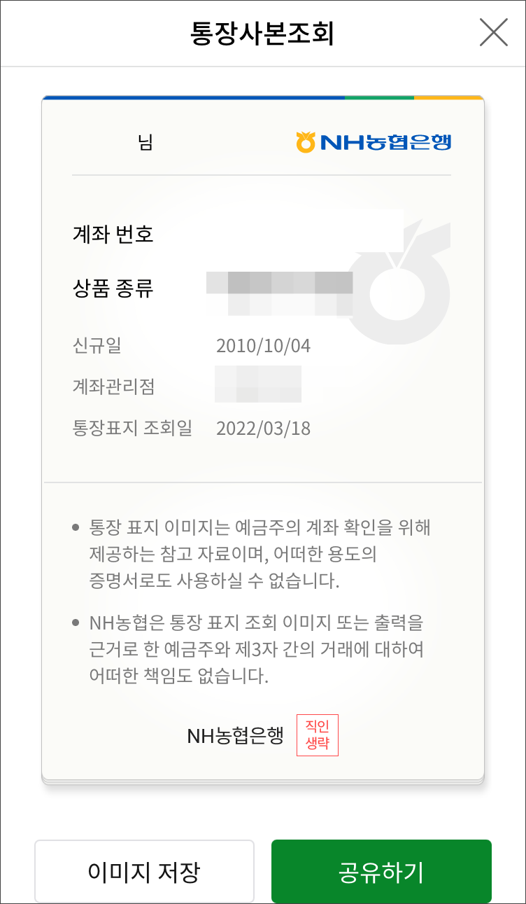 NH농협은행의 직인은 생략되어 나오네요.