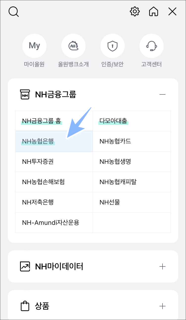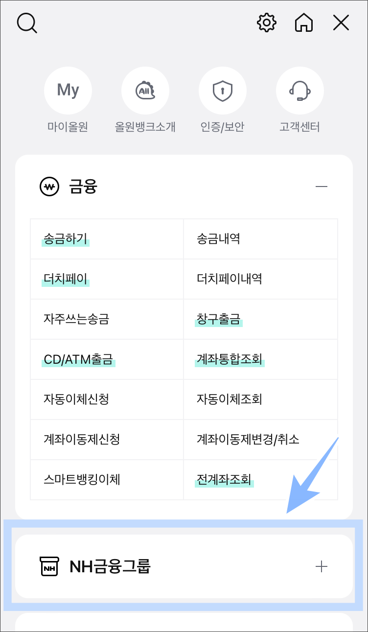 NH금융그룹 안에 NH농협은행으로 들어가줍니다.