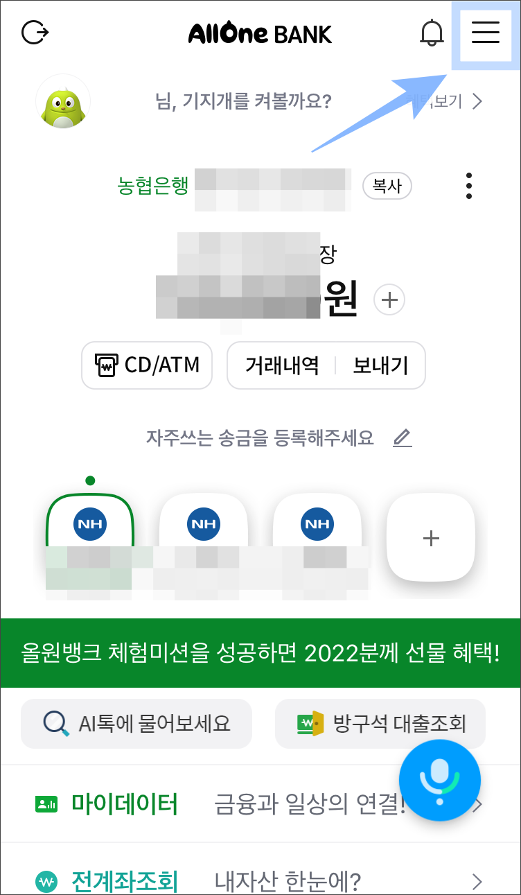 올원뱅크로 들어가서 로그인 후, 오른쪽 상단 삼선(≡)메뉴로 들어가줍니다.