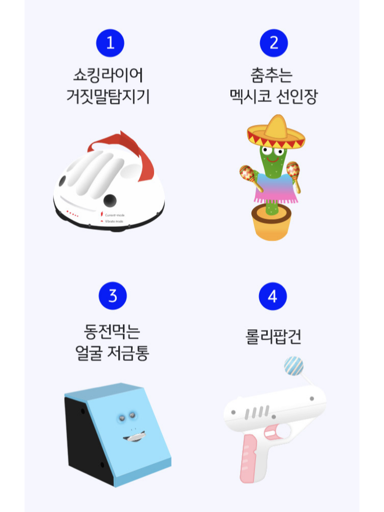 거짓말 탐지기, 롤리팝건, 동전먹는저금통, 춤추는멕시코선인장이 경품이에요~