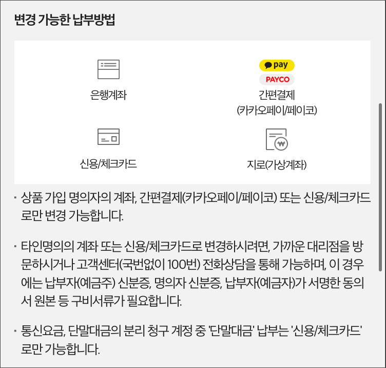 이렇게 앱을 통해서나 웹사이트를 통해서 요금납부 방법을 변경하는 것은 본인 명의의 계좌나 간편결제, 신용/체크카드로만 변경이 가능합니다. 다른 사람, 예를 들면 배우자 명의의 카드나 계좌등으로 바꾸고 싶다면 고객센터로 직접 전화해야합니다.