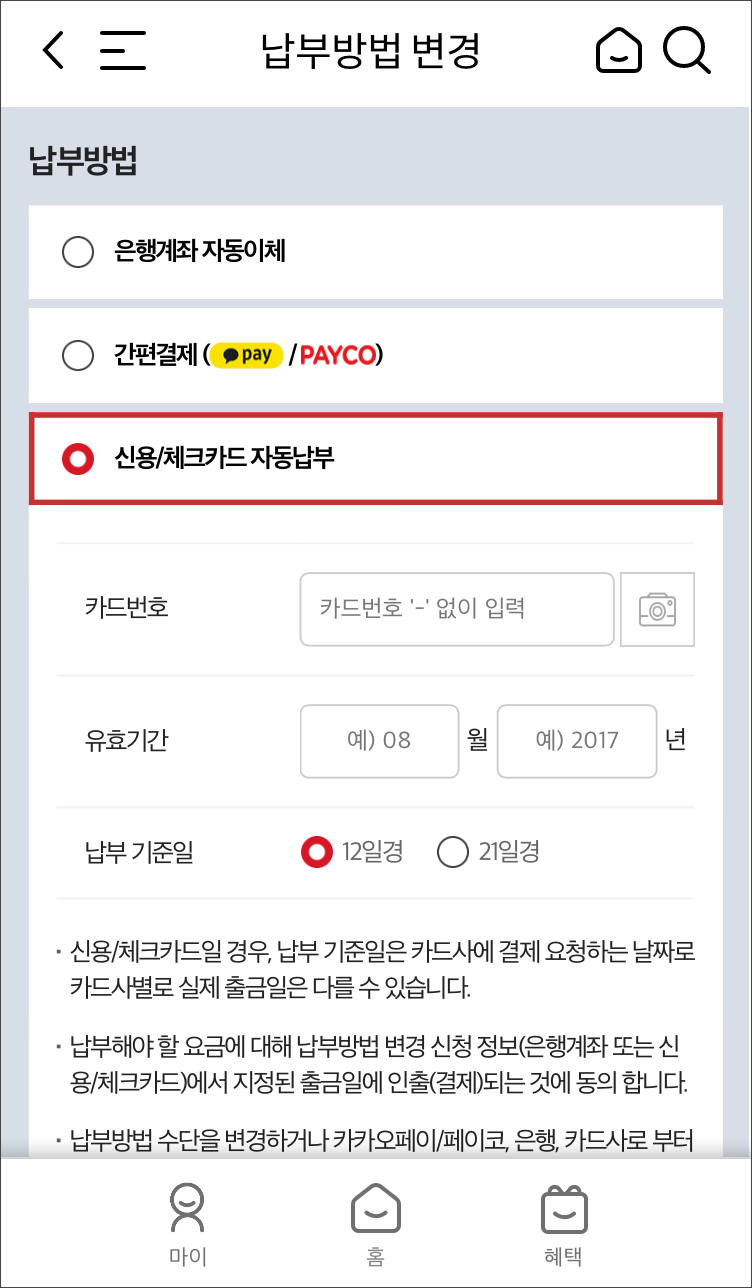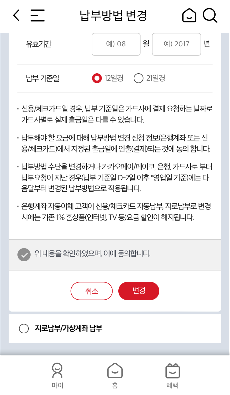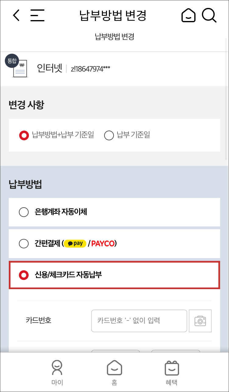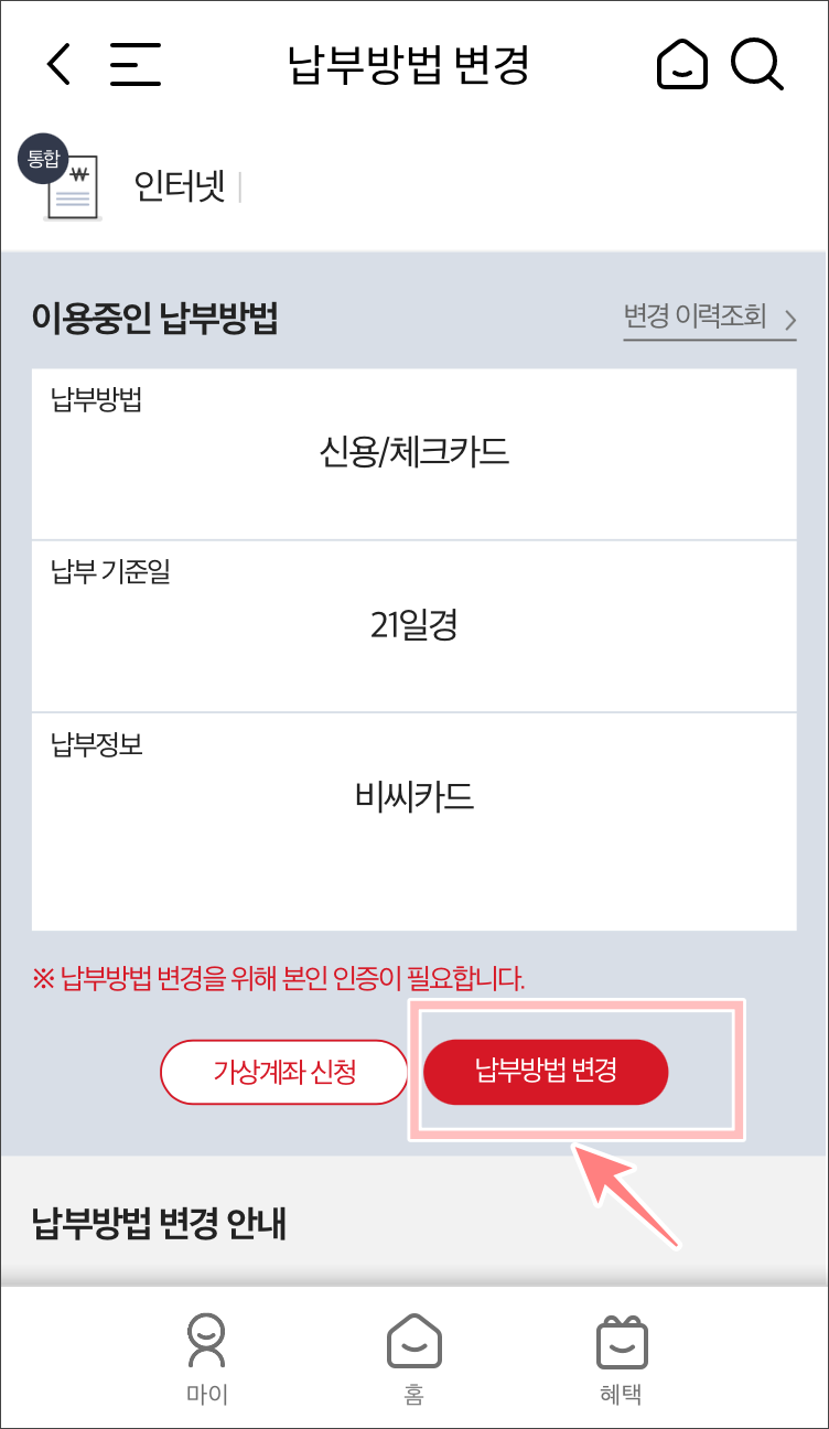 마이 > 요금/서비스 > 요금납부 > 납부방법 변경