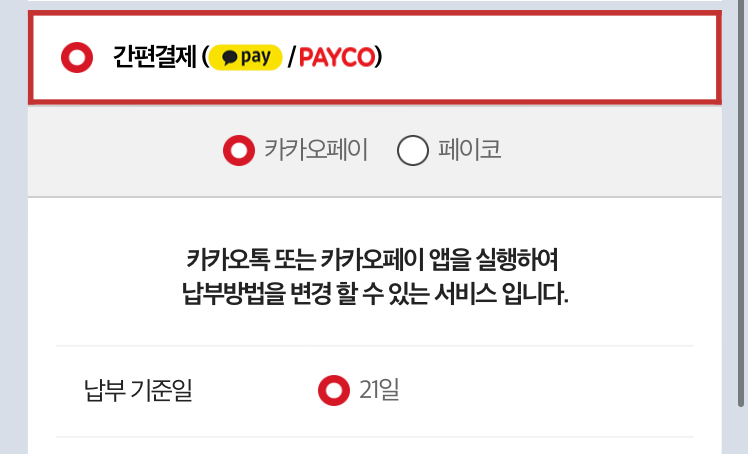 간편결제의 경우 카카오페이와 페이코에서 선택, 납부 기준일은 21일만 선택되네요.