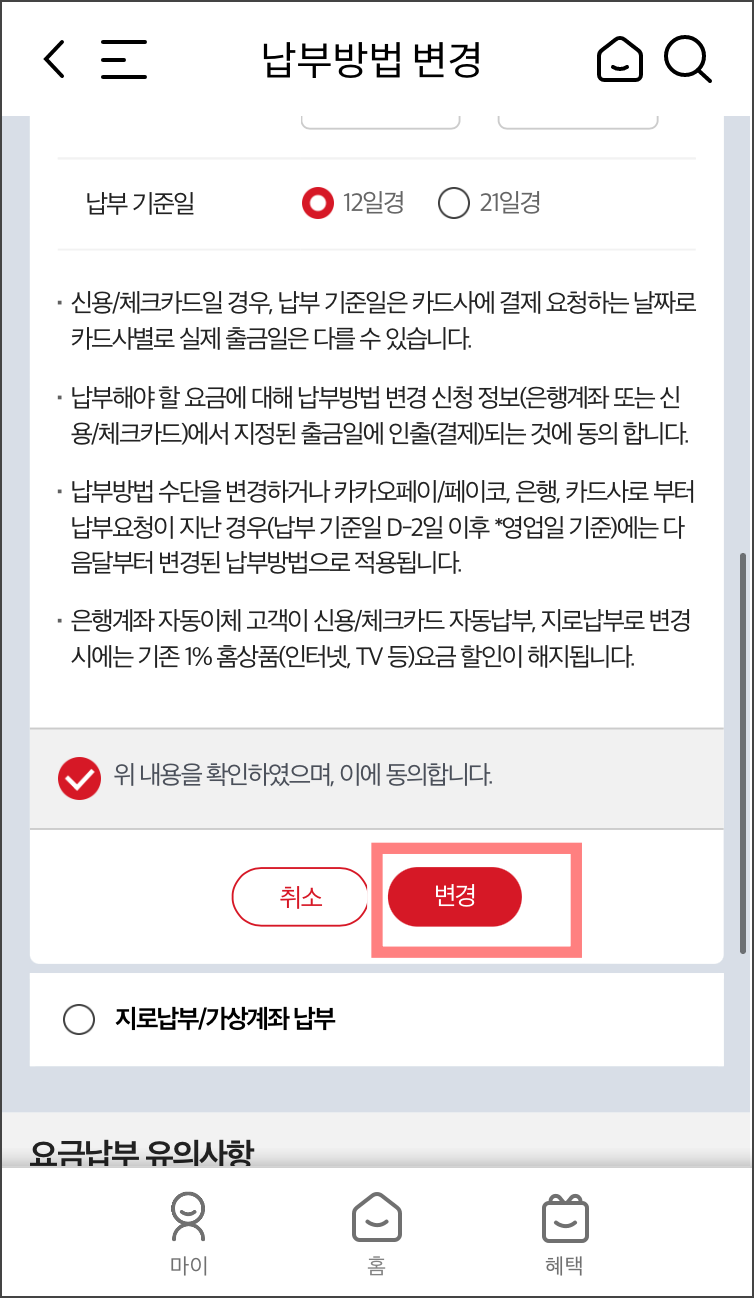 납부방법 변경을 모두 확인하였으면 동의에 체크하고 변경을 클릭해줍니다.