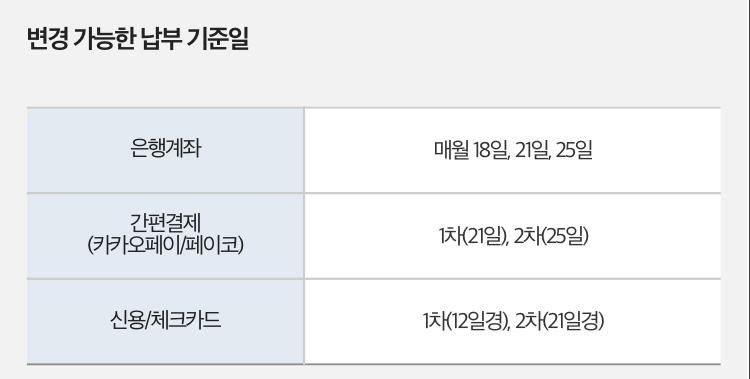 참고로 납부 기준일은 은행계좌, 간편결제, 신용/체크카드에 따라 다릅니다.