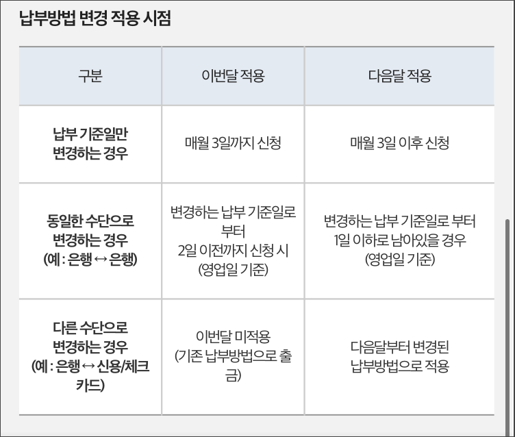오늘변경한 납부방법이 적용되는 시점은 아래를 참고하세요.