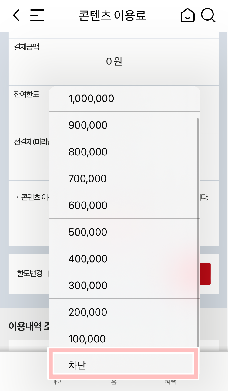 콘텐츠이용료의 한도는 백만원까지 설정이 가능하기 때문에, 필요치 않다면 금액을 낮추거나 차단하는 것이 좋습니다.