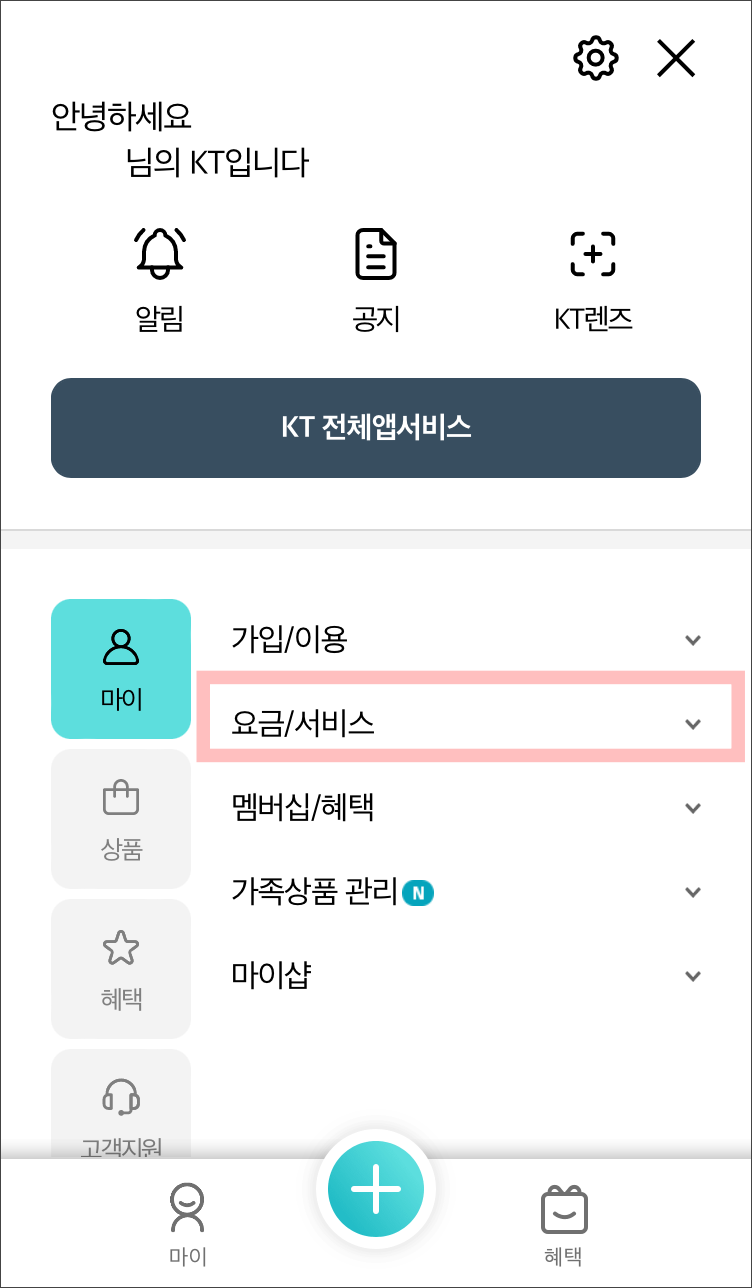 마이케이티앱을 이용하여 확인해보려고하는데, 케이티홈페이지(https://www.kt.com/)에서도 마이메뉴로 들어가서 똑같이 진행해보시면 됩니다. 고객센터(114)에 직접전화하여 설정할 수도 있으니 편한 방법을 이용하시면 됩니다.