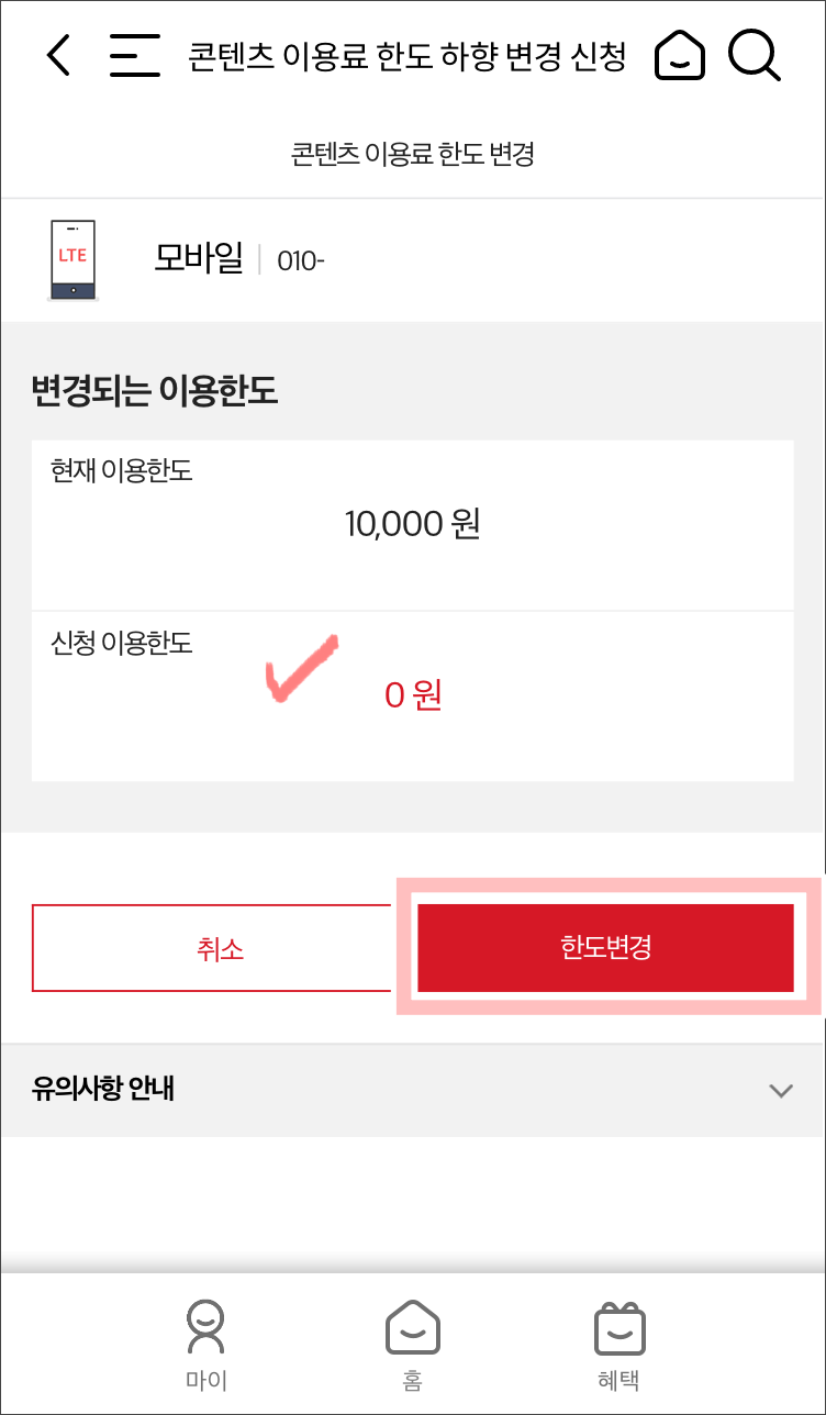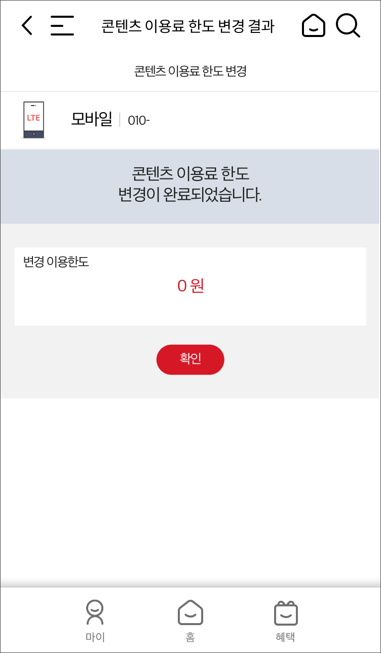 콘텐츠 이용료 한도변경이 완료되었습니다. 확인.