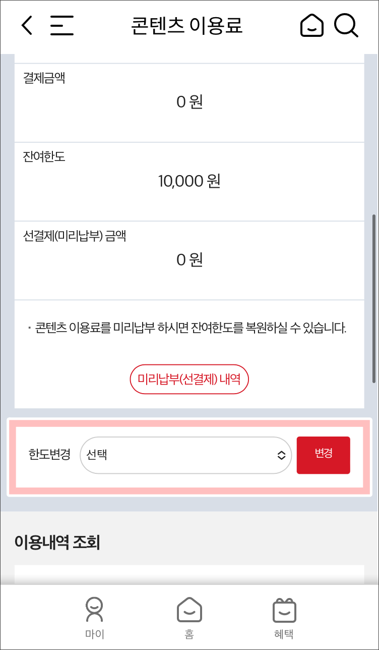 소액결제내역 확인 및 금액변경 및 차단을 원하시면 '소액결제 내역' 메뉴를 이용해주시고,