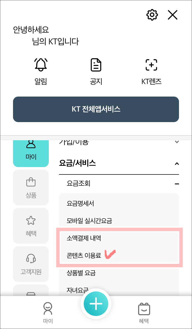 마이메뉴에서 요금/서비스메뉴를 펼쳐주시고, 요금조회를 열어주시면 소액결제내역 및 콘텐츠 이용료를 확인할 수 있습니다.