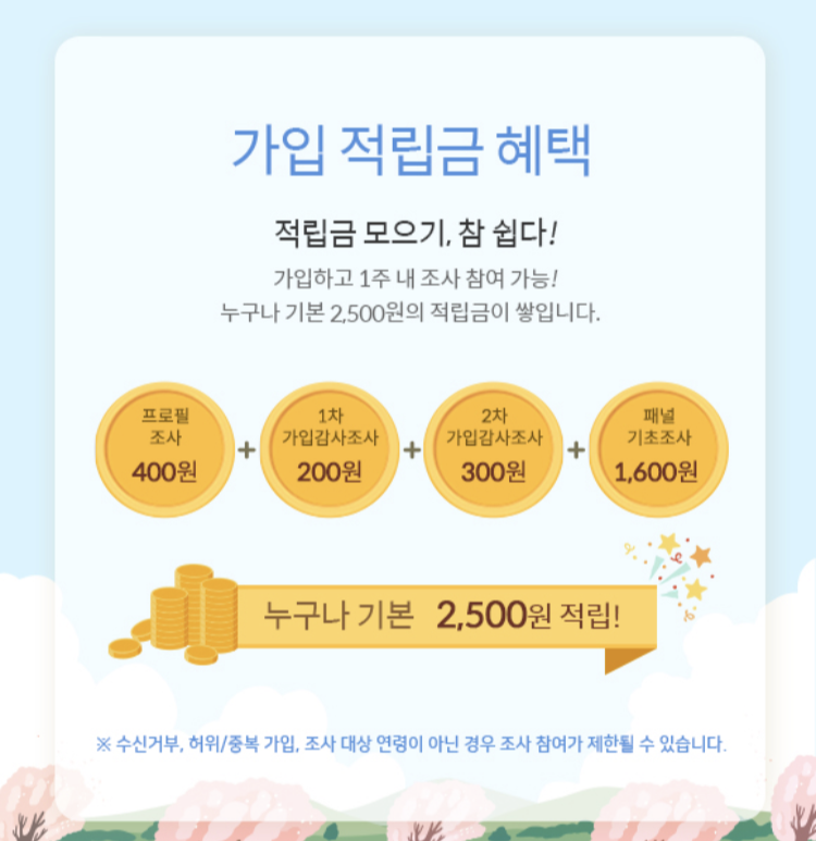프로필조사, 1차 가입감사조사, 2차 가입감사조사, 패널기초조사를 통해 2,500원을 적립할 수 있습니다.