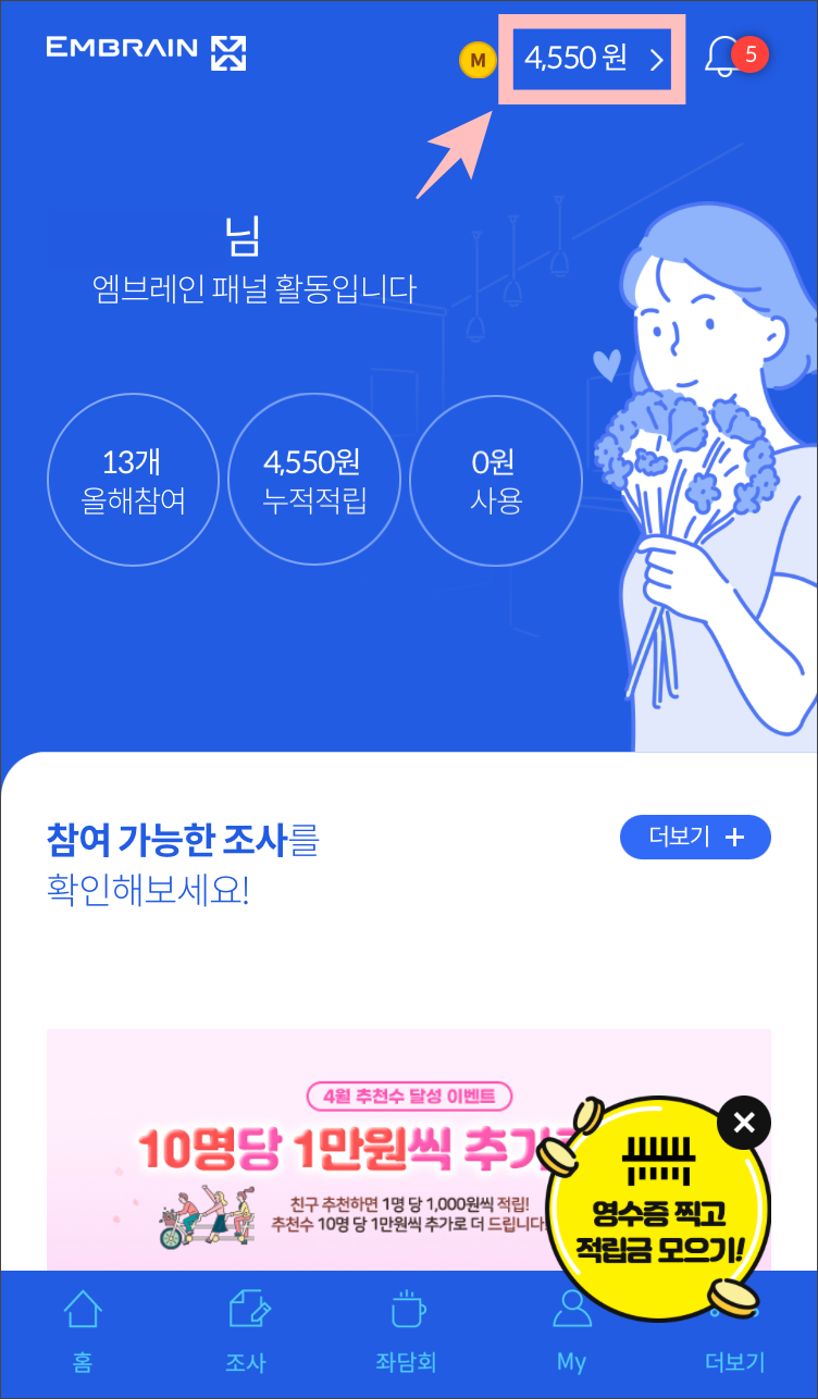 엠브레인패널파워앱의 상단 적립금 부분을 클릭하여 들어갑니다.