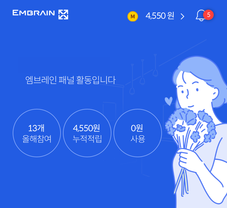 인터넷 설문조사 엠브레인 패널파워를 이용하고 있습니다. PC나 앱을 통하여 설문조사에 참여하여 적립금을 모을 수 있고, 모은 적립금은 현금이체나 상품권구매 등으로 이용할 수 있습니다.