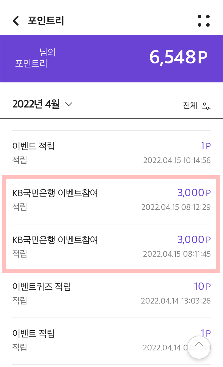 KB페이 이용 이벤트 참여로 6,000포인트리 지급완료!