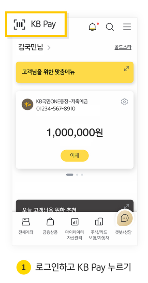 - 로그인하고 왼쪽 상단 KB Pay 누르기
