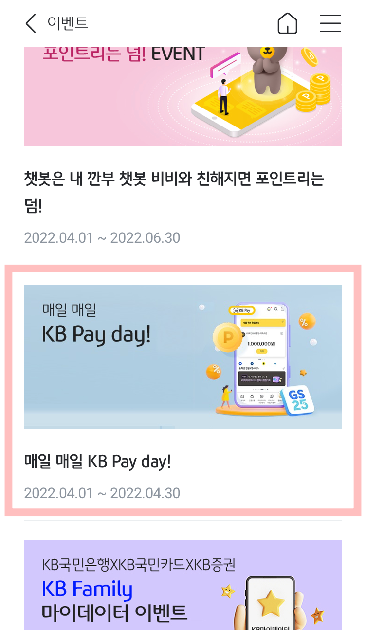👉 KB스타뱅킹 오른쪽 상단 삼선(≡)메뉴 -> 생활/혜택 -> 혜택 -> 이벤트 -> 진행중인 이벤트 -> KB Pay day!