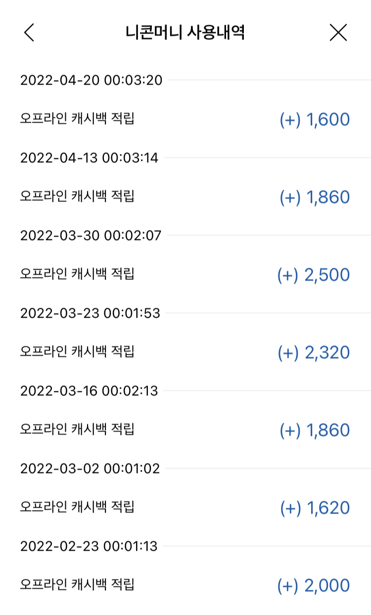 아래는 제가 몇 달동안 받은 캐시백 내역입니다.