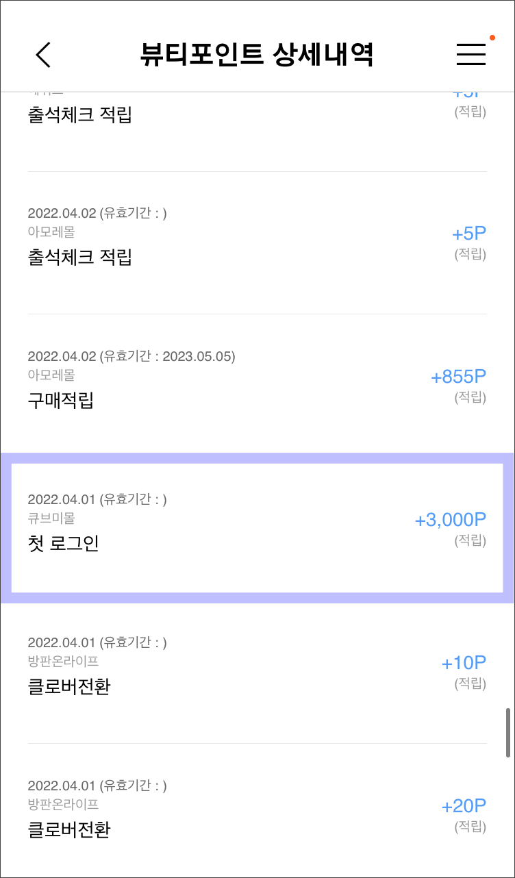 위 이미지는 제가 받은 뷰티포인트 내역입니다.