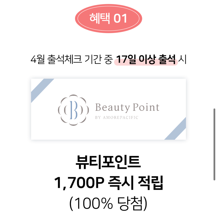 출첵이벤트는 4월기준으로 17일 이상 출석하게되면 1,700P를 한꺼번에 지급합니다.