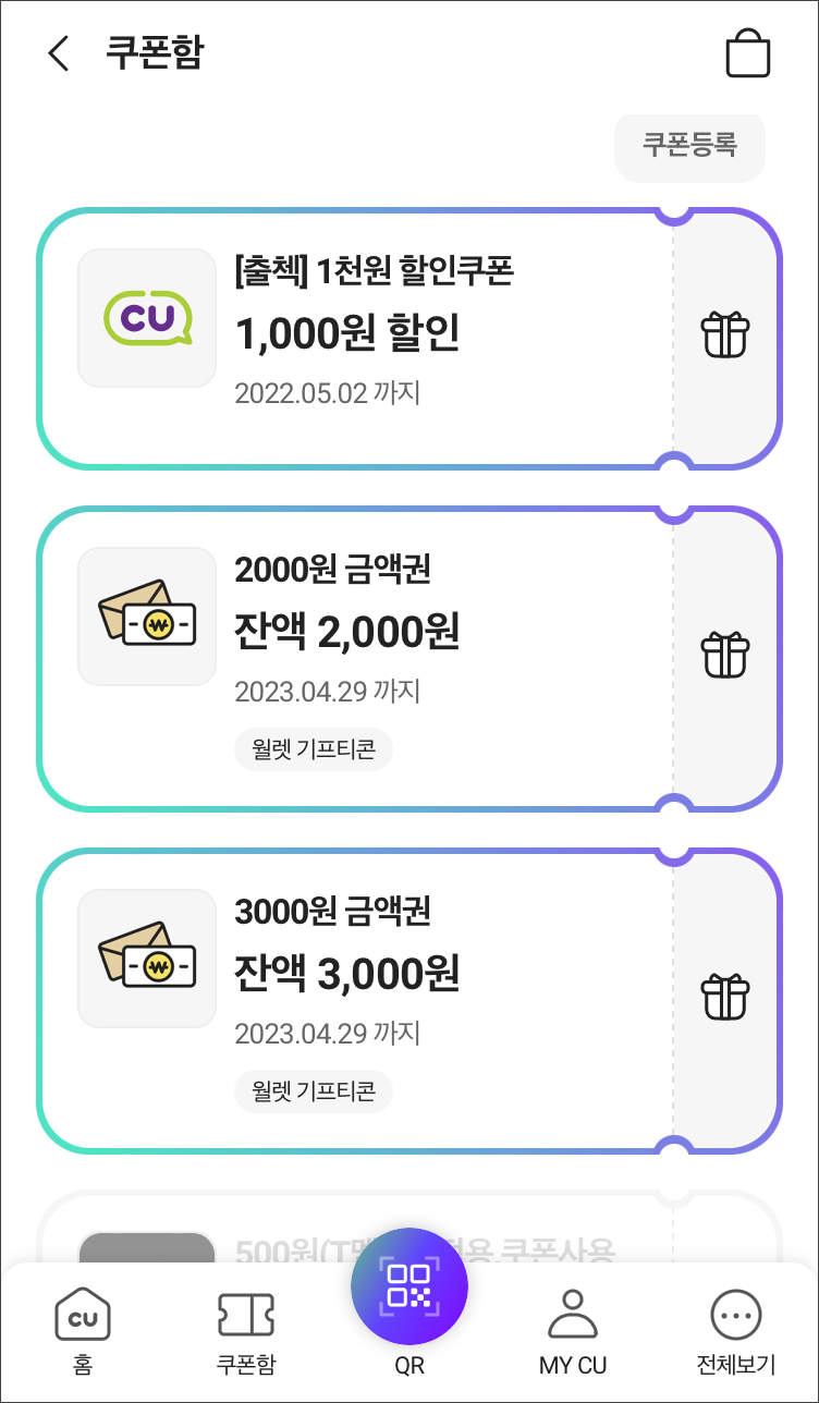 다른 곳에서 얻거나 구매한 CU쿠폰은 쿠폰함에 들어가서 쿠폰등록 버튼을 이용하여 등록하시면 결제시 편리하게 이용하실 수 있습니다.