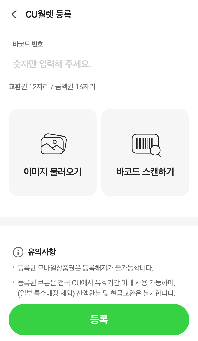바코드를 스캔하거나, 이미지로 다운로드 되어있다면 이미지 불러오기하거나, 바코드 숫자를 직접 입력해도 됩니다. (교환권 12자리, 금액권 16자리의 숫자)