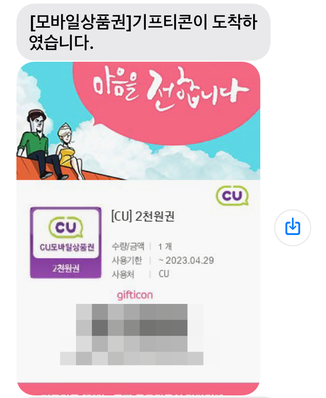 위와 같이 문자로 받은 기프티콘에는 바코드와 쿠폰번호(모자이크부분)가 있어요.