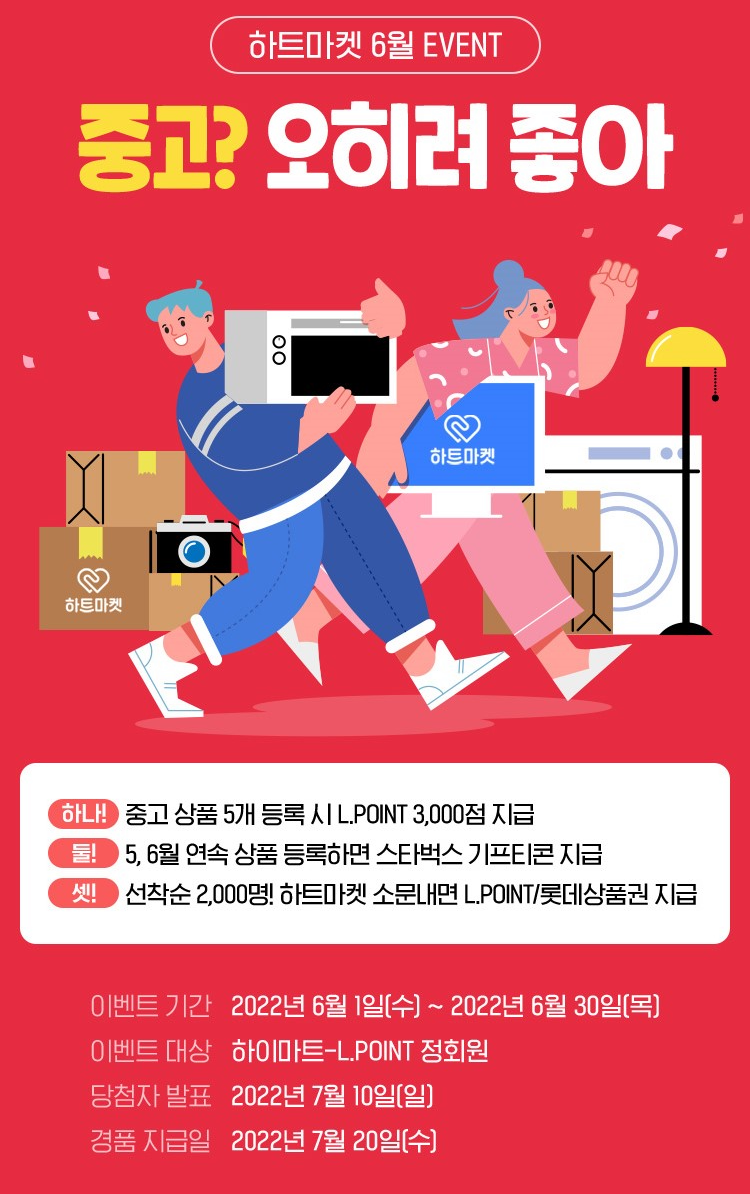 롯데하이마트에서는 하트마켓이라는 중고거래 플랫폼을 런칭하여 운영중인데요, 하트마켓 6월 이벤트로 중고상품을 등록하면 엘포인트를 지급하고 있습니다.