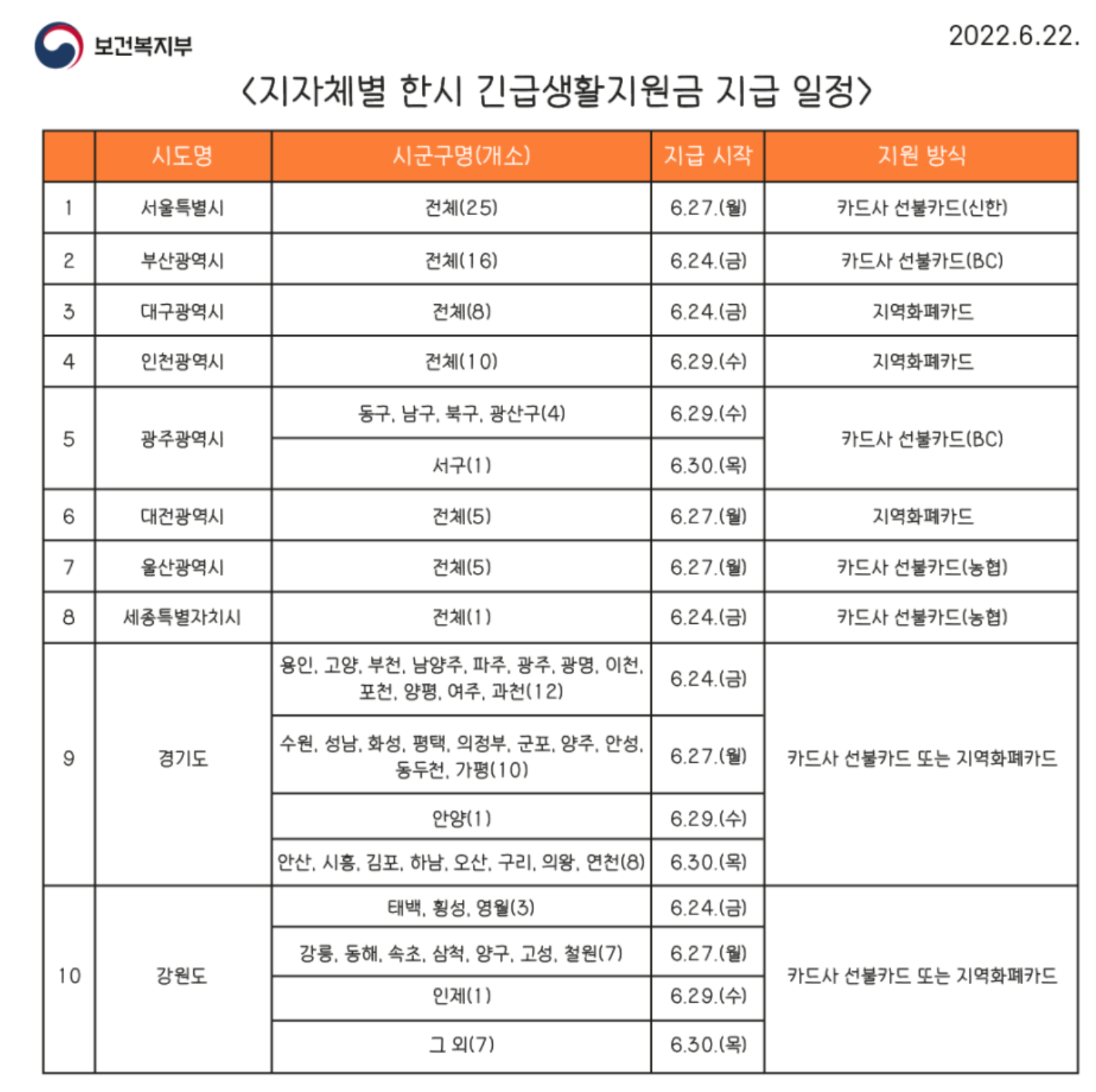 6월 24일 부터 개시하여 지자체 사정에 따라 30일 까지 순차적으로 지급할 예정입니다.