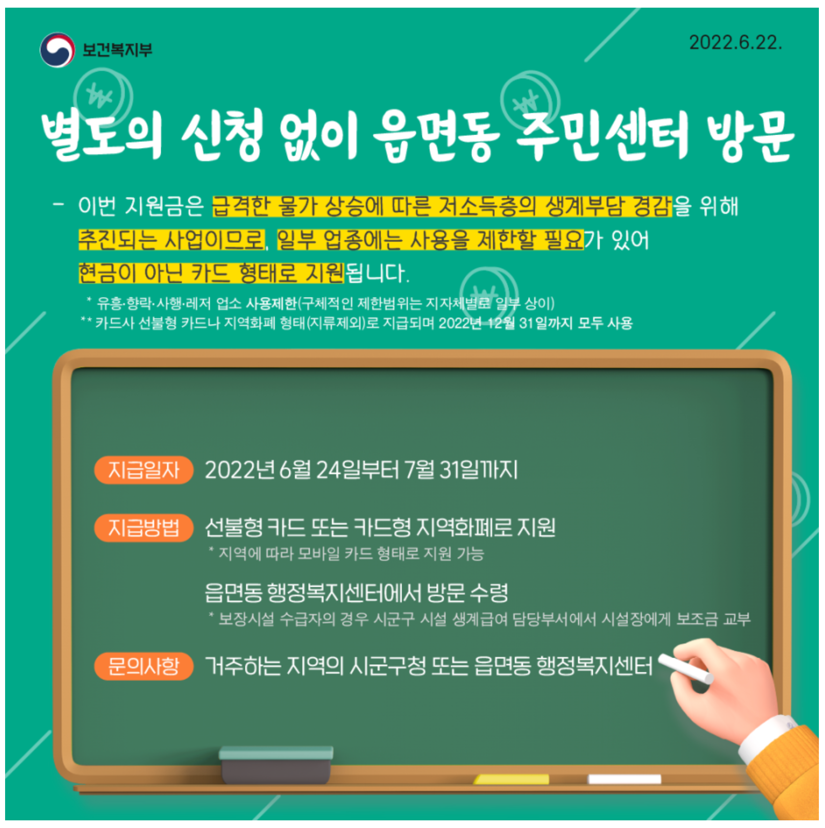 바로 선불형 카드형태로 지급될 예정으로 카드신청 역시 별도로 할 필요는 없지만, 지자체별로 조금씩 다를 수 있기 때문에 신청 시기 및 지급방법에 대하여 거주지의 지자체에서 확인해보시는 것이 좋겠습니다